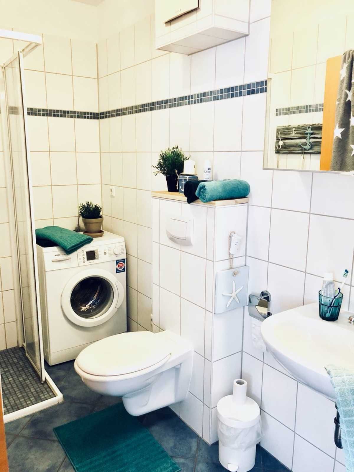 - Badezimmer mit ebenerdiger Dusche und Waschmaschine