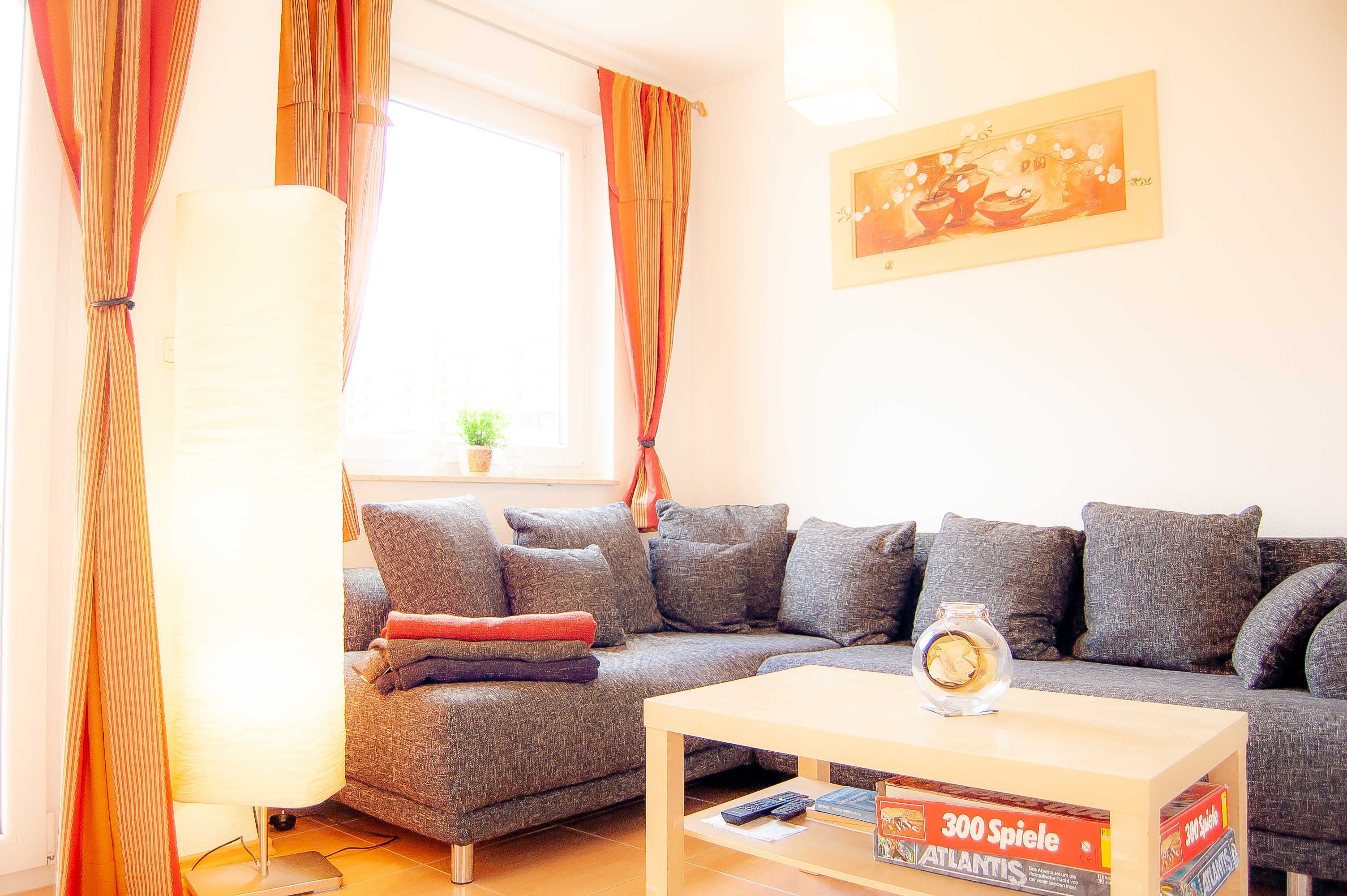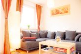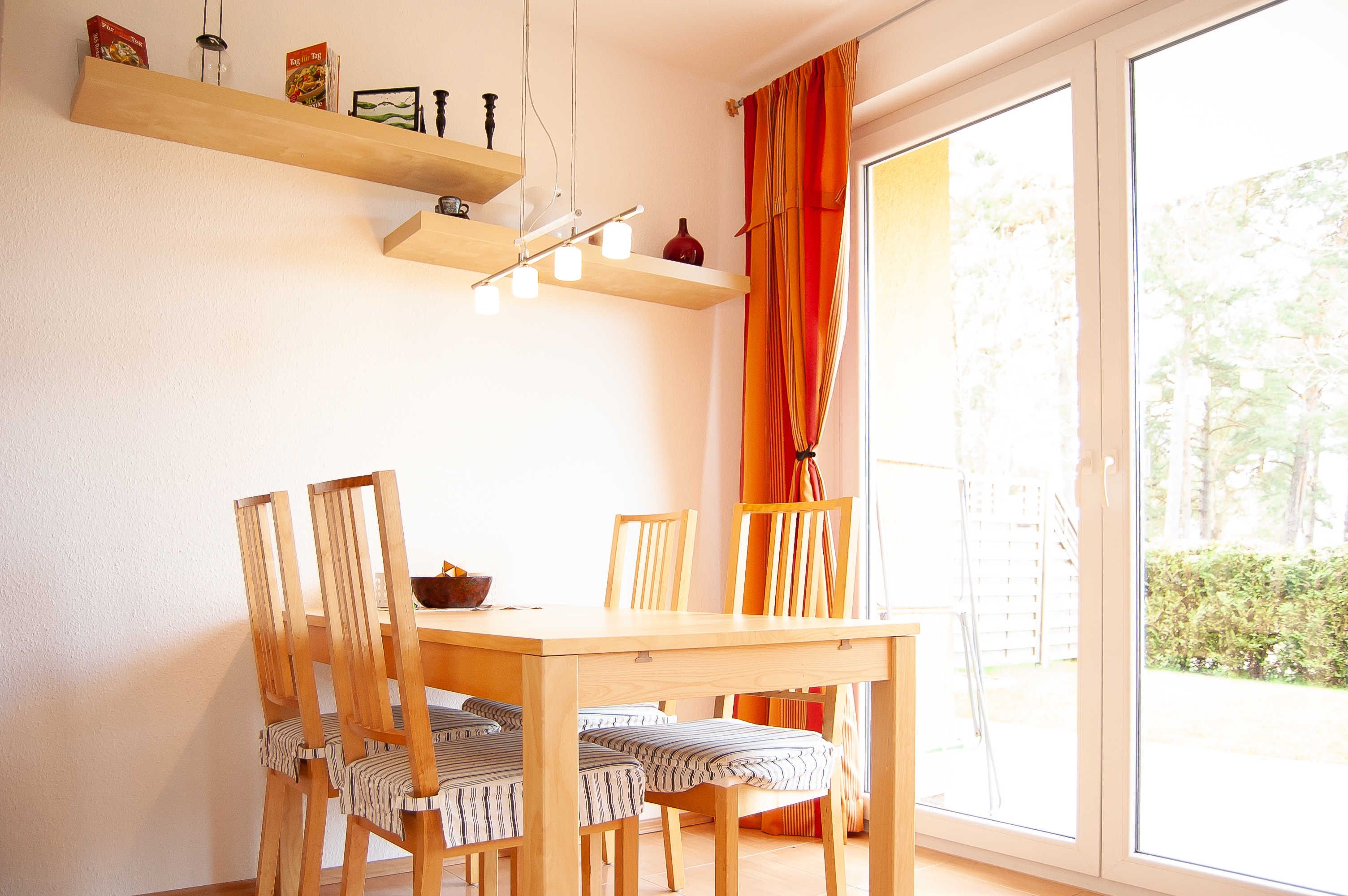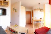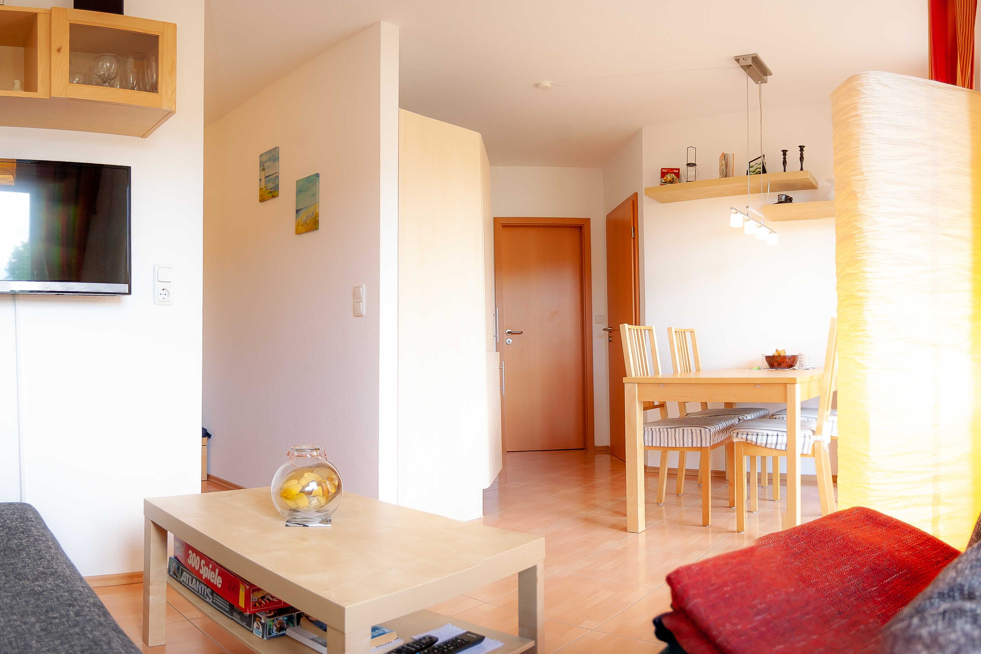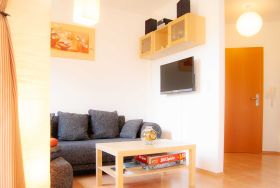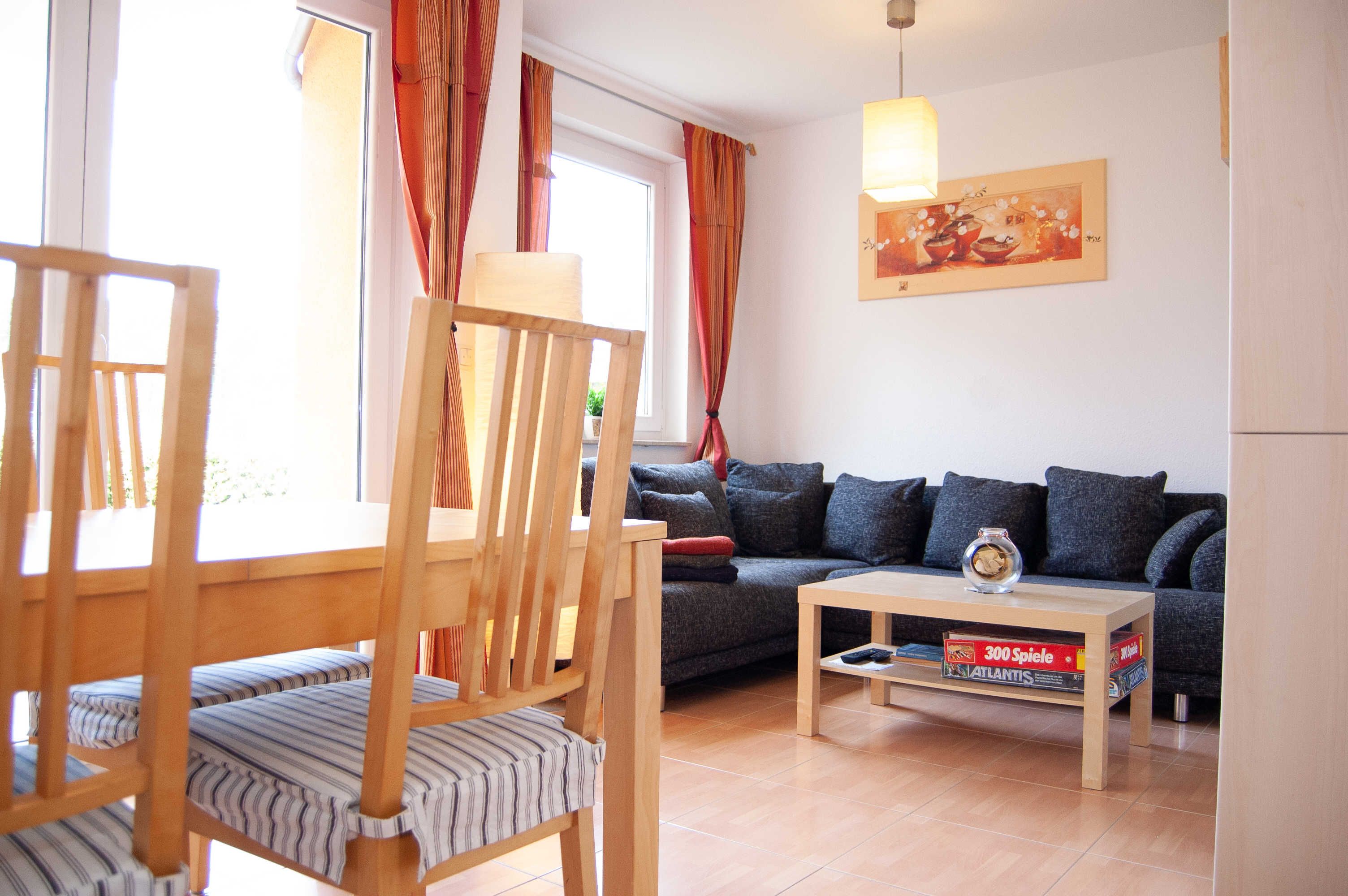 Die Ferienwohnung verfügt über ein Wohnzimmer mit offenem Küchen- und Essbereich, ein separates Schlafzimmer und ein Duschbad. Das Schlafzimmer ist mit einem Doppelbett und Kleiderschrank ausgestattet. Das Wohnzimmer mit ausziehbarer Couchgarnitur ist für die Übernachtung einer Person geeignet. Das Badezimmer mit einer ebenerdigen Dusche und einer Wandheizung zum Trocknen der Handtücher versehen.