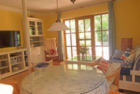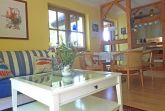Sie liegt an der östlichen Giebelseite des Hauptgebäudes mit separatem Eingang und Zugang zum Meer auf kürzestem Weg. Die Wohnung misst über zwei Etagen großzügige 68 qm. Der stilvoll eingerichtete Wohn-Essbereich mit Flatscreen-TV, Radio, Telefon einer komplett ausgestatteten Küche (Wasch- und Spülmaschine, Backofen mit 4-Zonen-Ceranfeld etc.) mit Küchentresen befindet sich im Erdgeschoss.