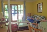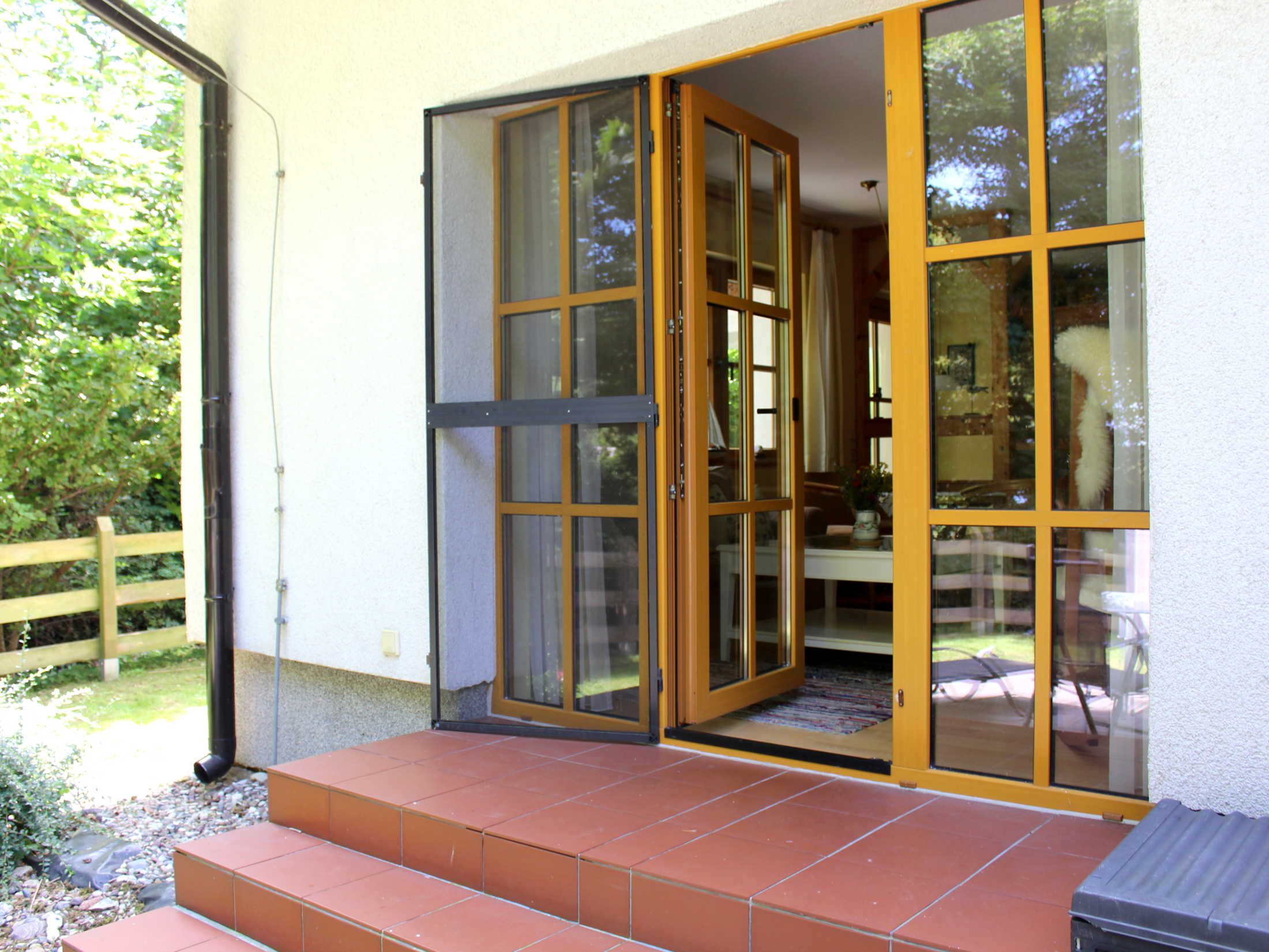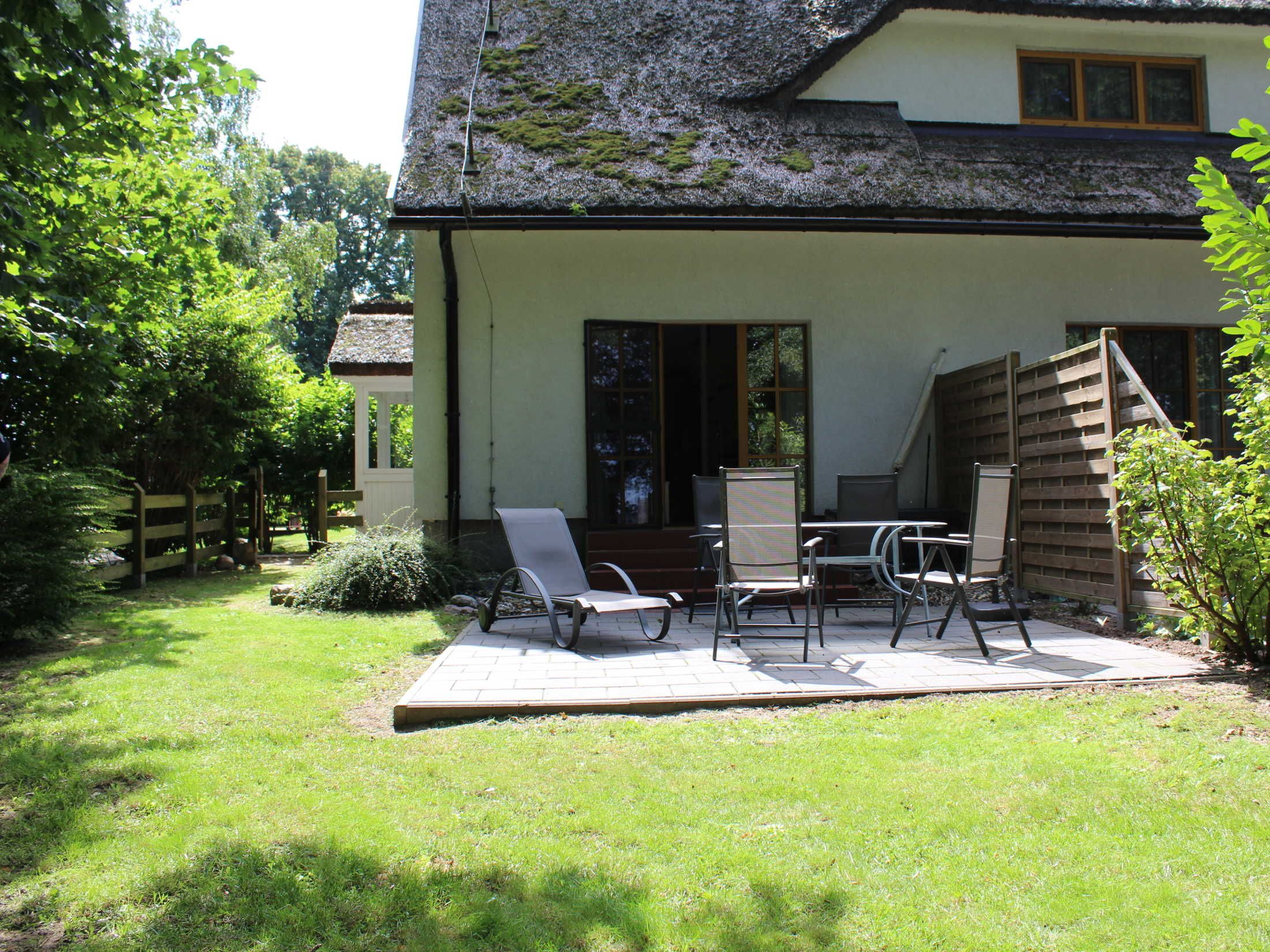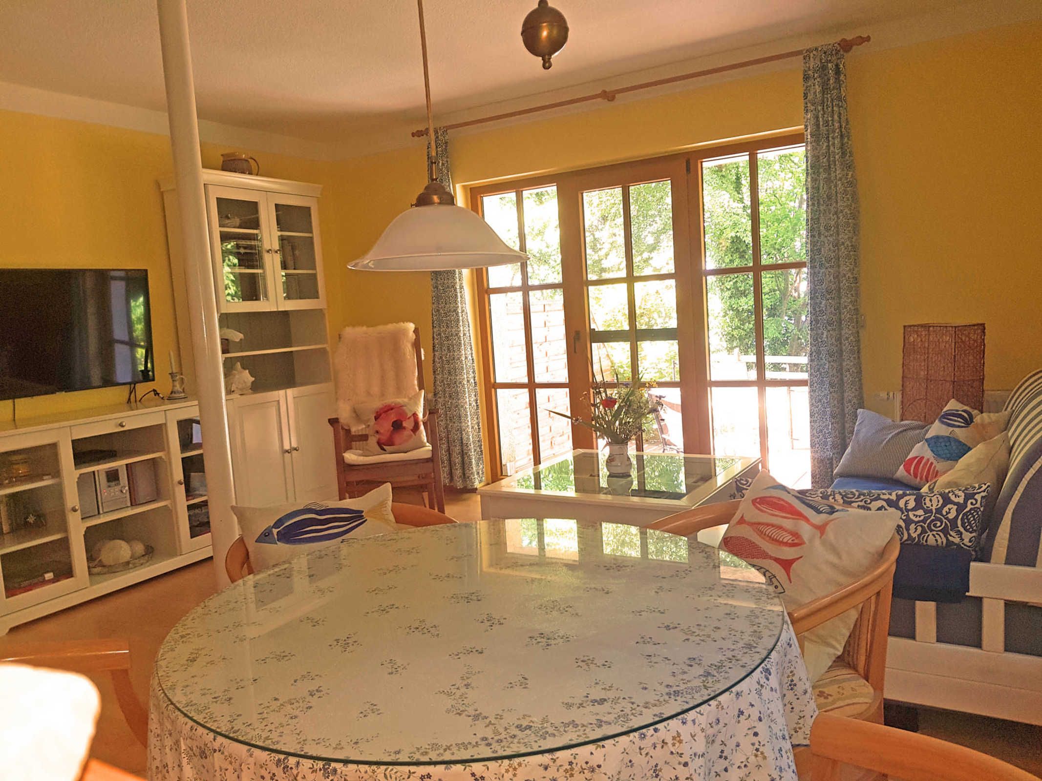Das Wohnzimmer führt direkt auf die geschützt gelegene möblierte Terrasse mit Boddenblick.