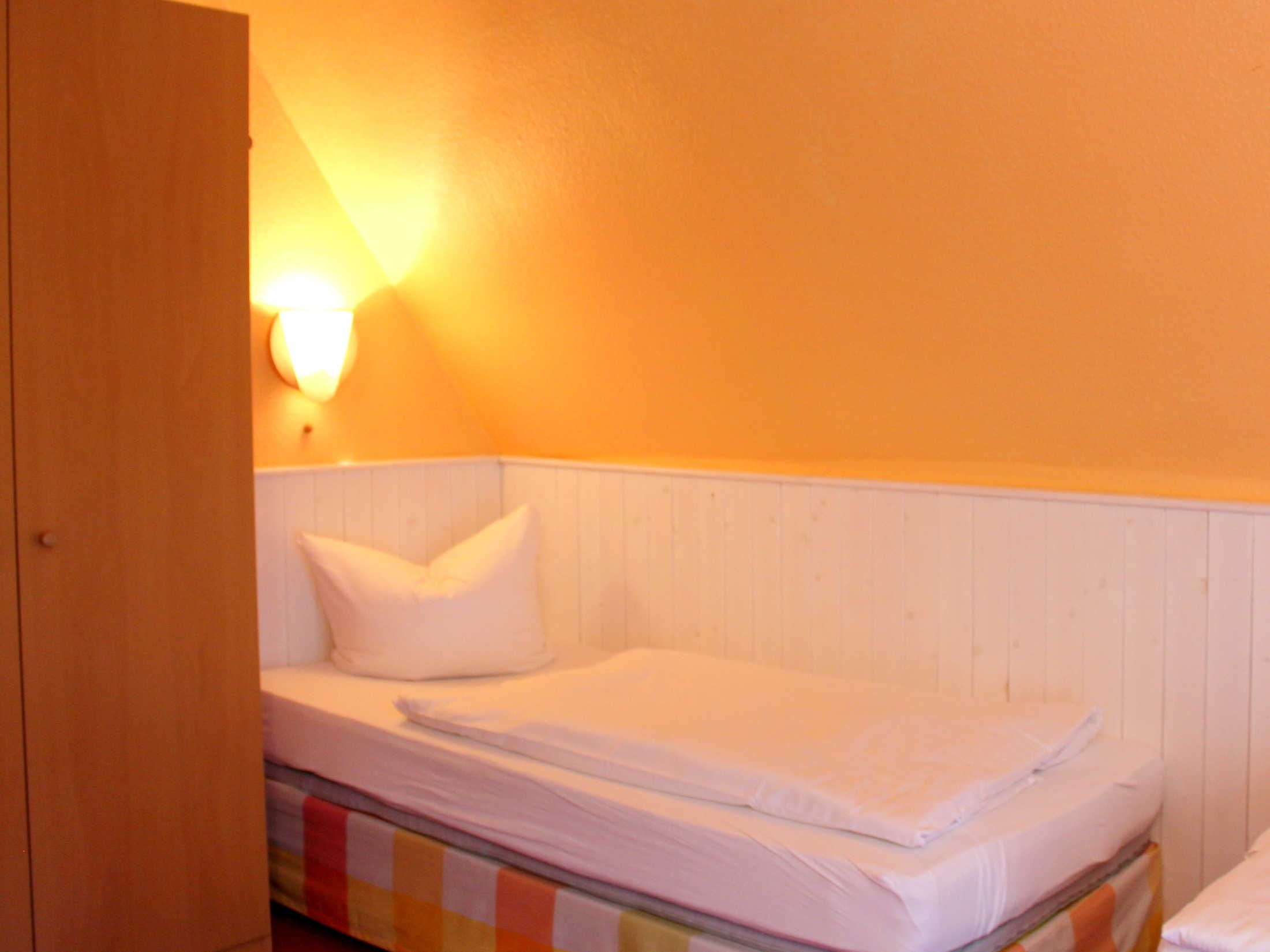 Über eine Wendeltreppe erreichen Sie ein gemütlich eingerichtetes Schlafzimmer mit Doppelbett und Leseplatz. Im benachbarten zweiten Schlafzimmer stehen zwei normal große Schlafliegen. Kleiderschrank und Kommode bieten viel Stauraum. Beide Räume sind trotz Dachschrägen großzügig.