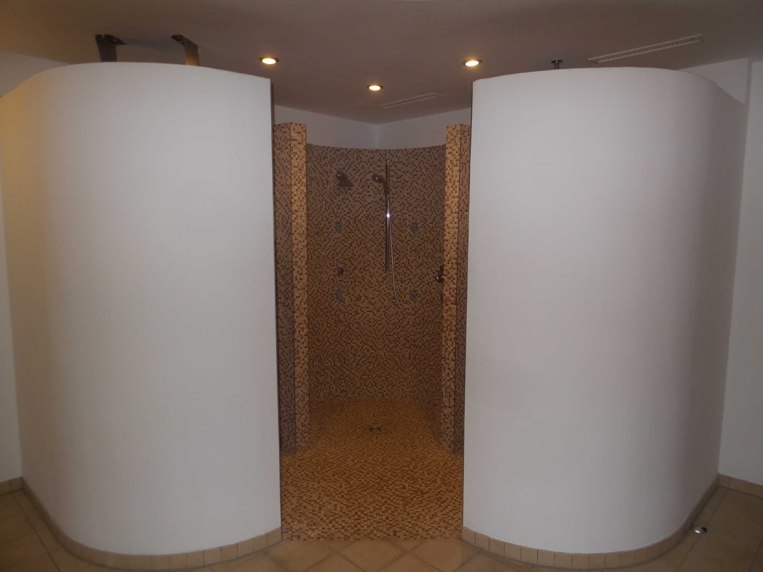 Badezimmer mit großer Dusche, WC und Föhn