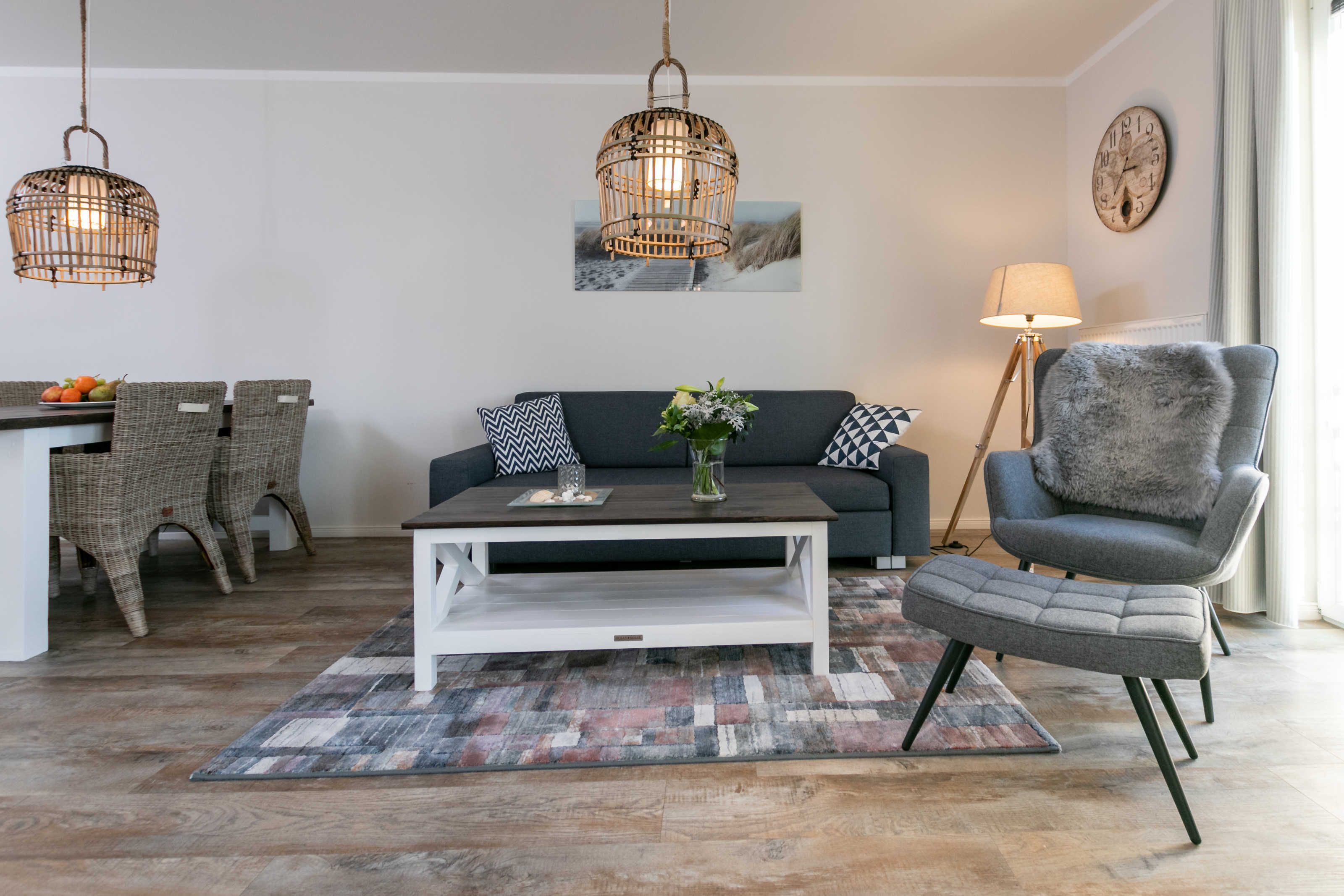 Wohnzimmer mit Couchgarnitur (Schlafcouch für 1-2 Personen, Liegefläche 1,80 x 2,00m), Sessel, Flachbild-TV, Radio, Internetzugang (WLAN inkl.), Esstisch