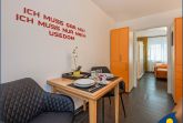 Im Kücheneinbauschrank finden Sie ein 2-Platten-Cerankochfeld, Steckdosen für Küchengeräte sowie ein Geschirrspüler. Nach der Nutzung verschwindet die Mini-Küche einfach wieder hinter den Türen. In der Wohnküche befinden sich ein ebenfalls freistehender Kühlschrank mit Gefrierfach.