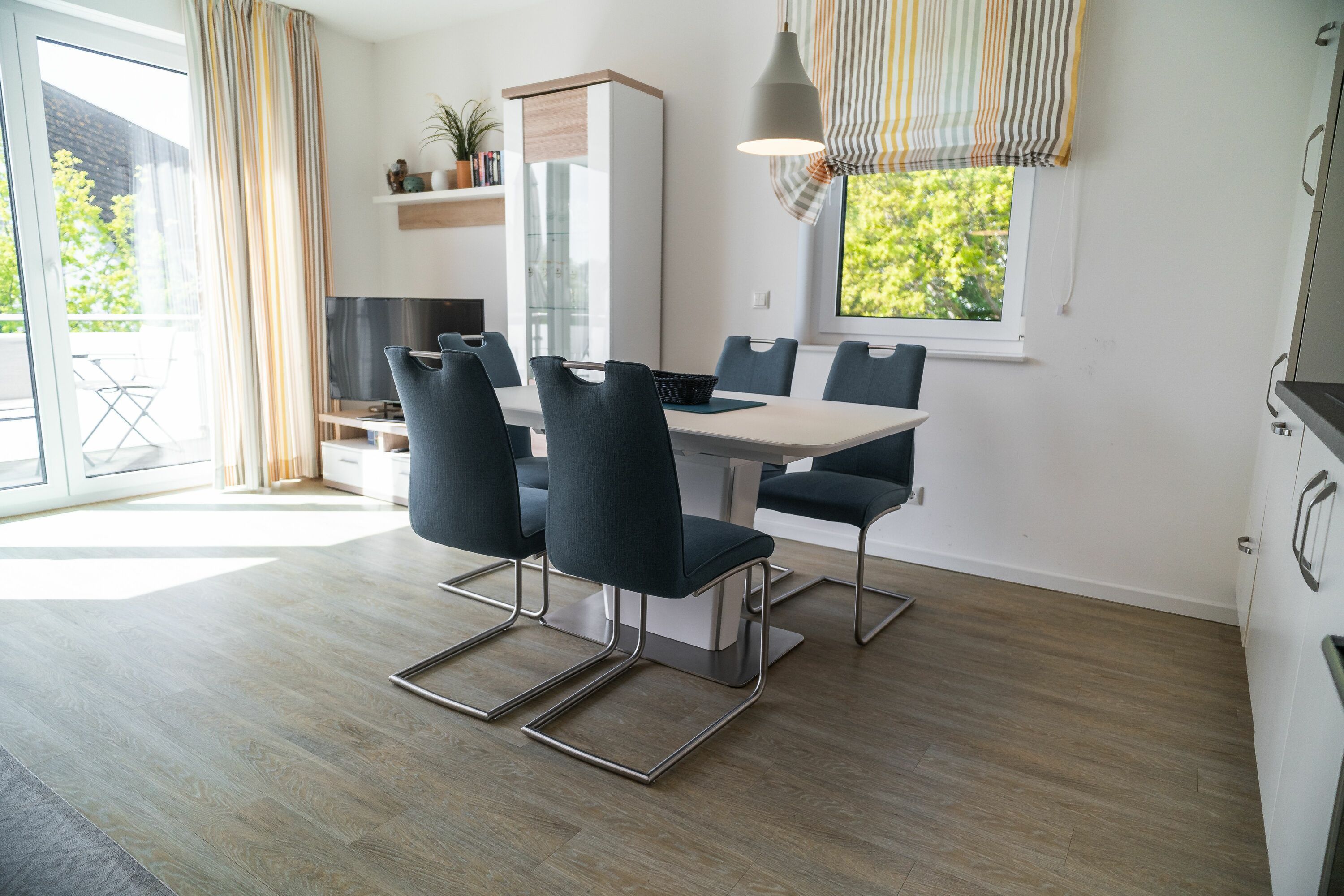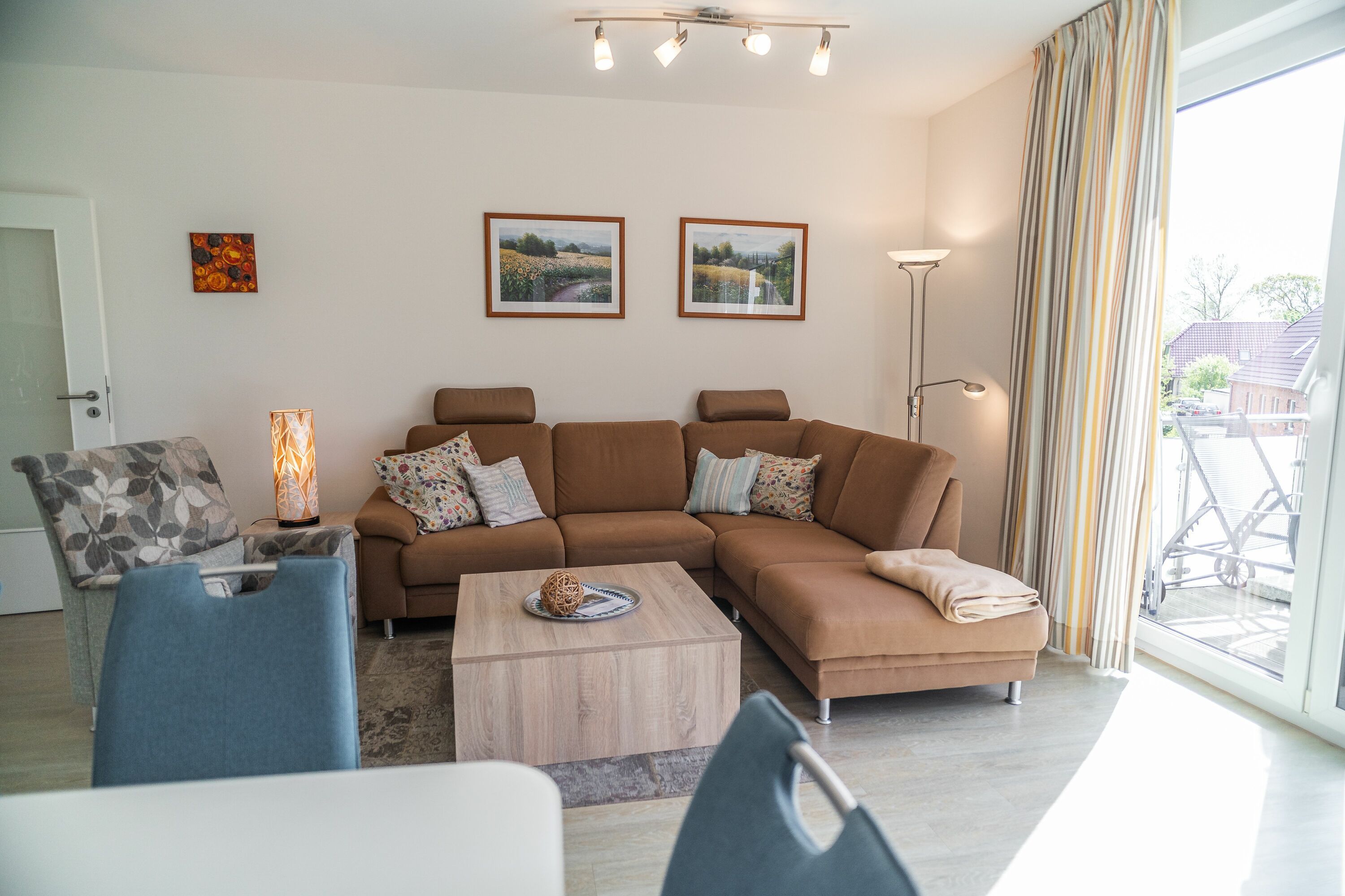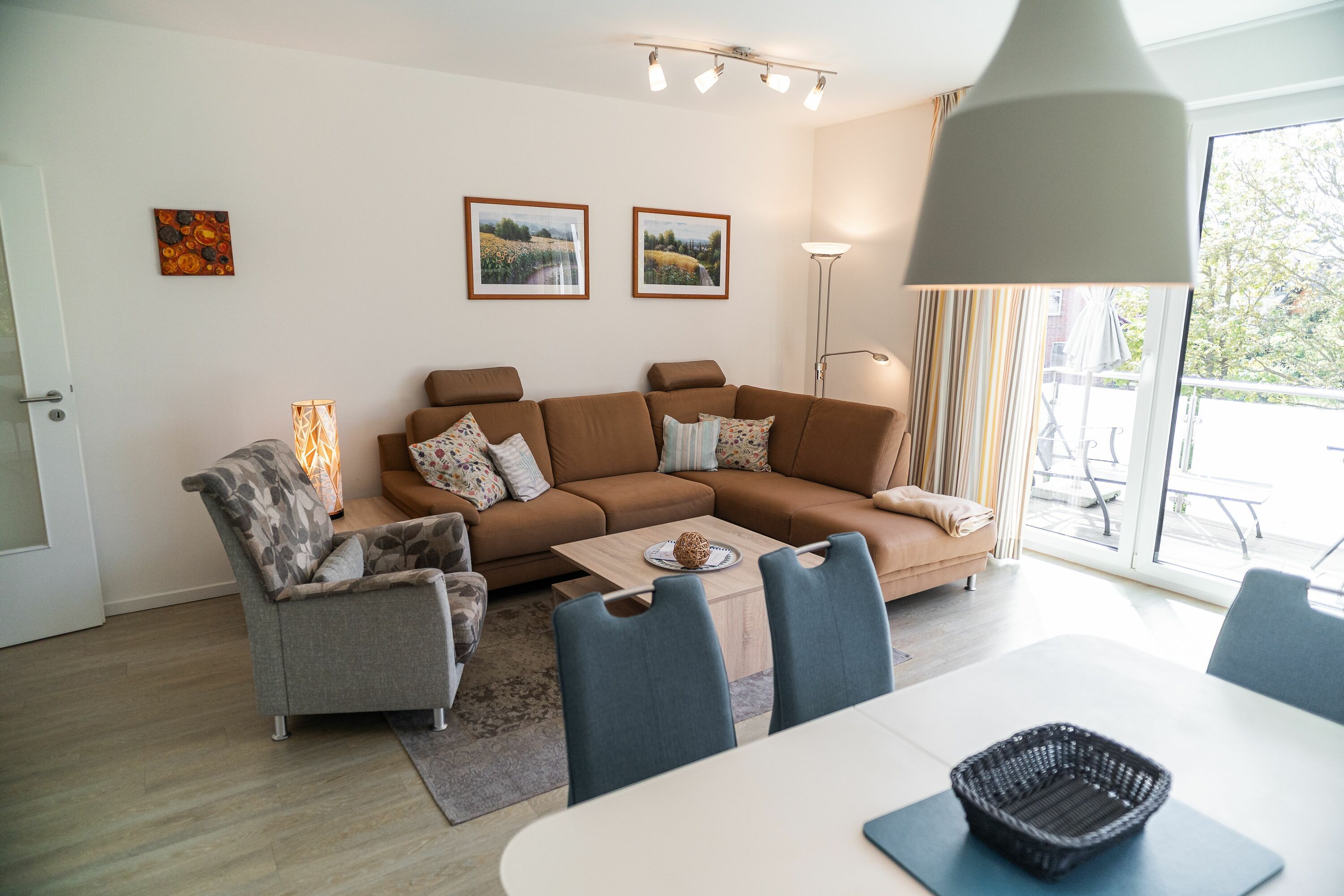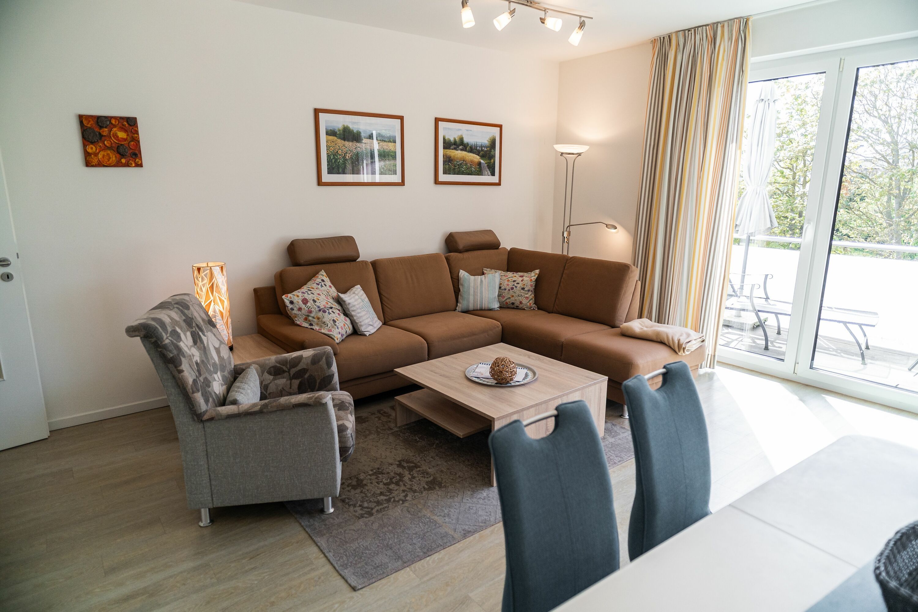 Im hellen und geschmackvoll eingerichteten Wohnzimmer laden eine gemütliche Eckcouch mit passendem Sessel sowie ein großer Esstisch, der für vier Personen bequem Platz bietet, zum Verweilen ein. Bücher und Gesellschaftsspiele befinden sich ebenfalls in der Wohnung. Weiterhin gehören ein LED-TV, ein DVD-Player sowie eine kleine Stereo-Anlage zur technischen Austattung. Vom Wohnzimmer aus gelangen Sie auf den Balkon. Genießen Sie hier ein gemütliches Frühstück in angenehmer Morgensonne, Balkonmöbeln und Sonnenschirm sind vorhanden.