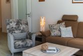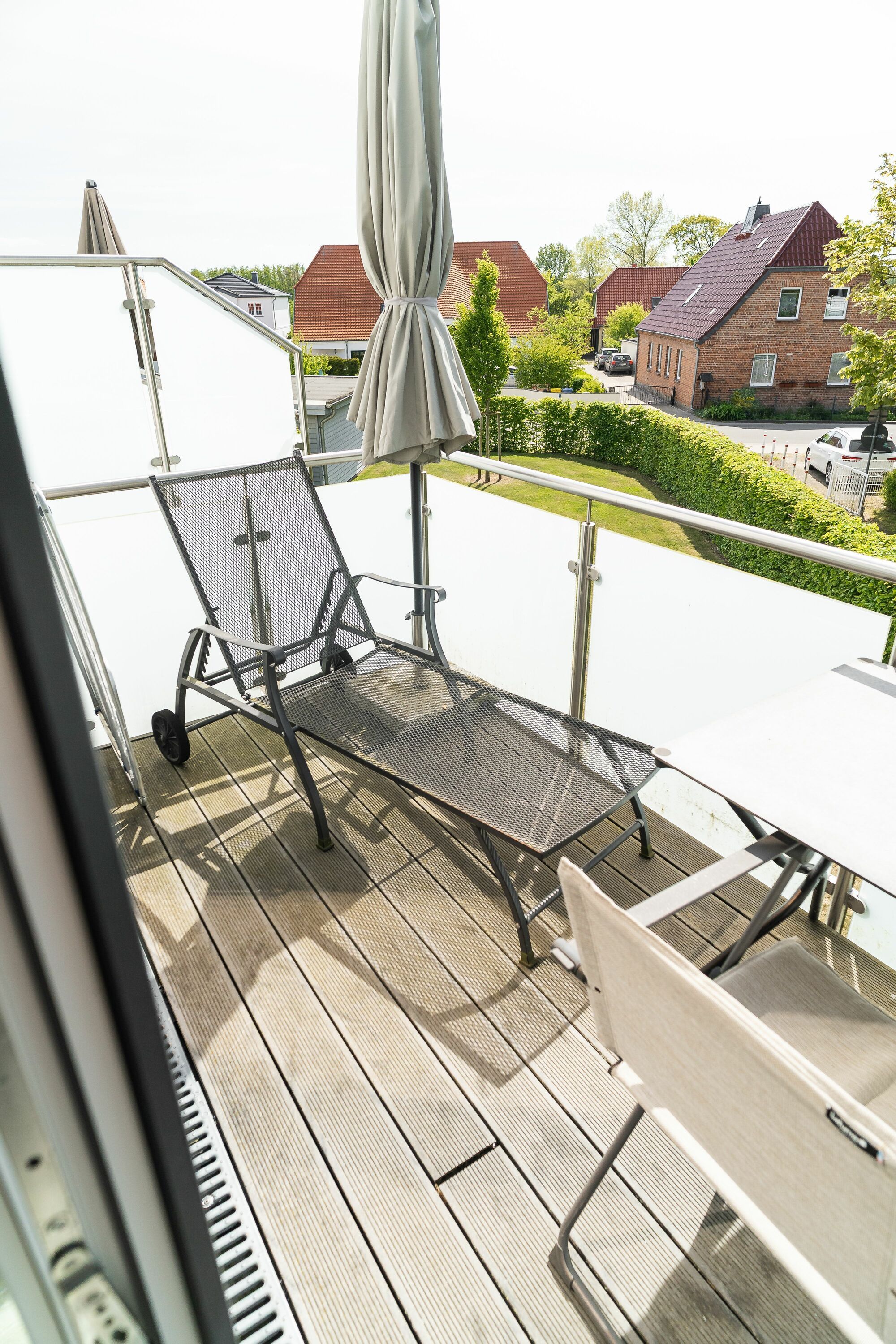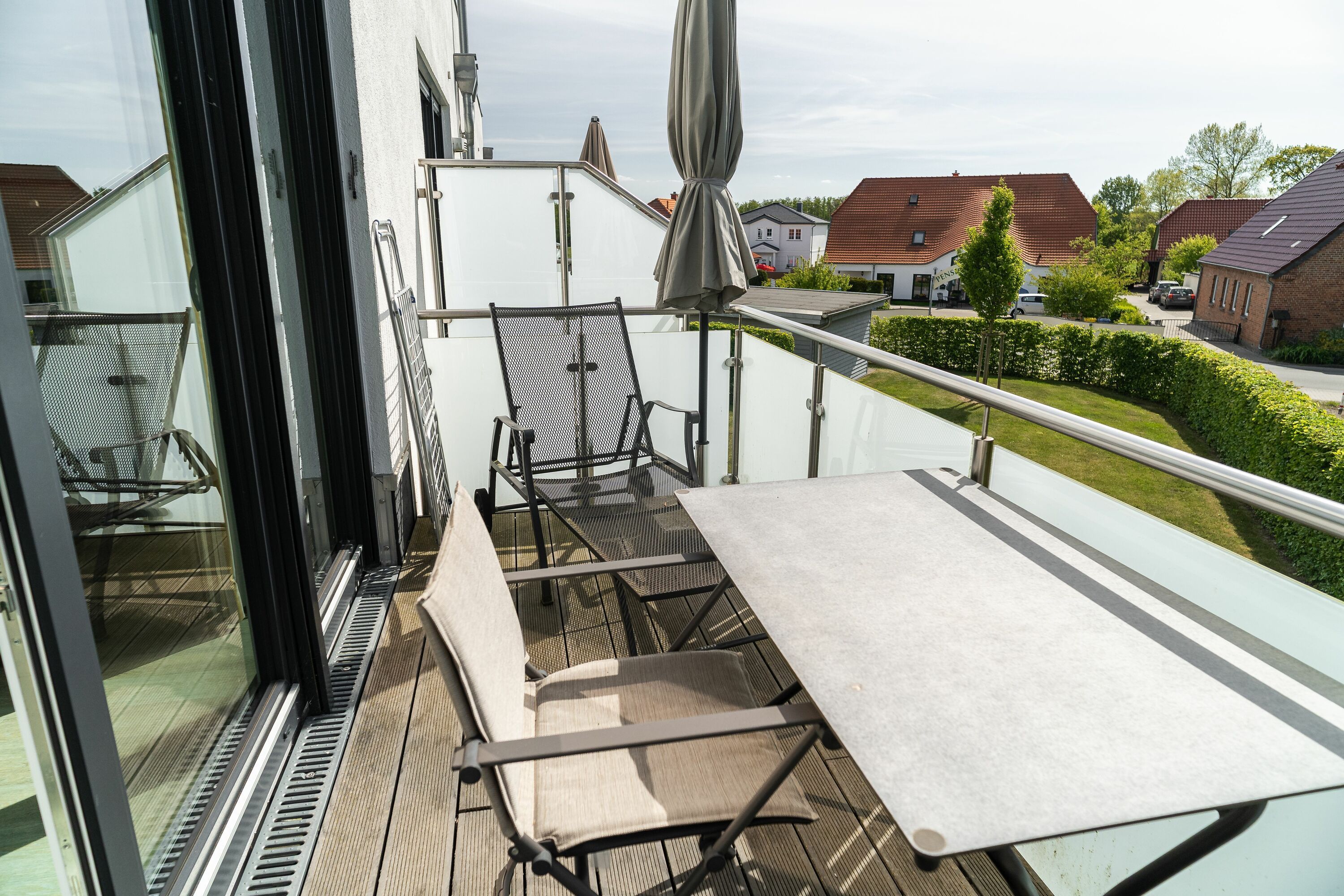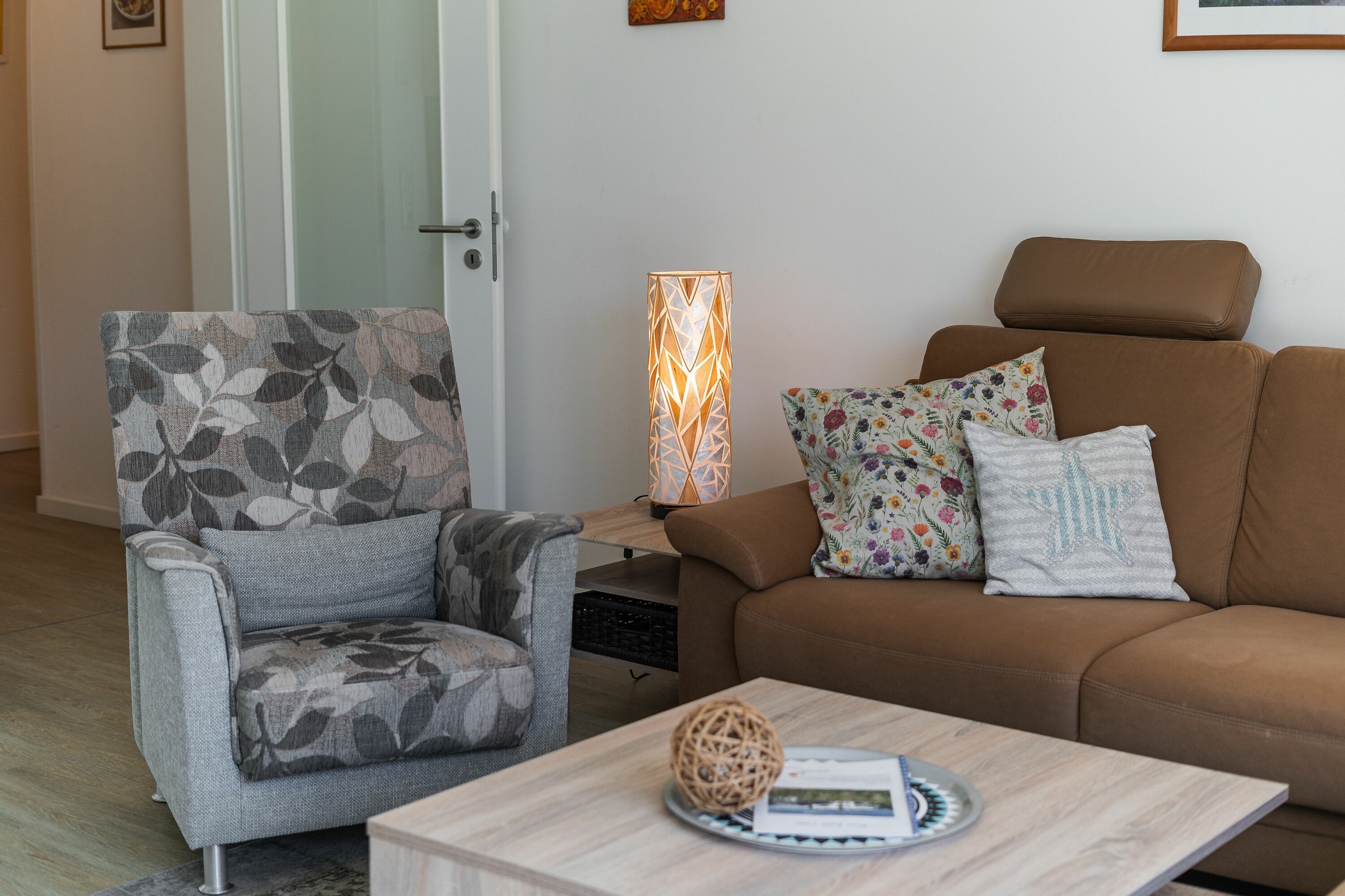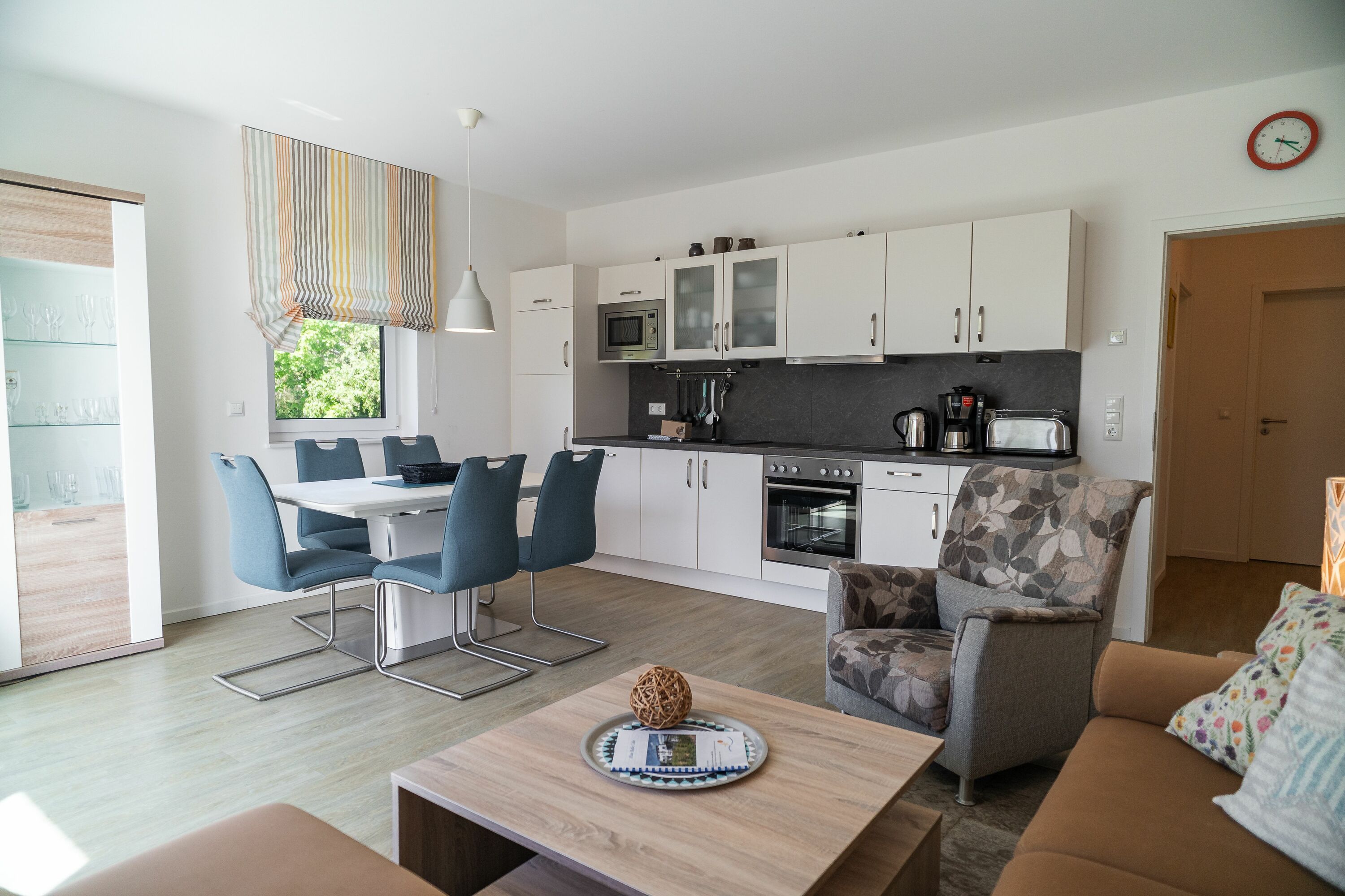 Im hellen und geschmackvoll eingerichteten Wohnzimmer laden eine gemütliche Eckcouch mit passendem Sessel sowie ein großer Esstisch, der für vier Personen bequem Platz bietet, zum Verweilen ein. Bücher und Gesellschaftsspiele befinden sich ebenfalls in der Wohnung. Weiterhin gehören ein LED-TV, ein DVD-Player sowie eine kleine Stereo-Anlage zur technischen Austattung. Vom Wohnzimmer aus gelangen Sie auf den Balkon. Genießen Sie hier ein gemütliches Frühstück in angenehmer Morgensonne, Balkonmöbeln und Sonnenschirm sind vorhanden.