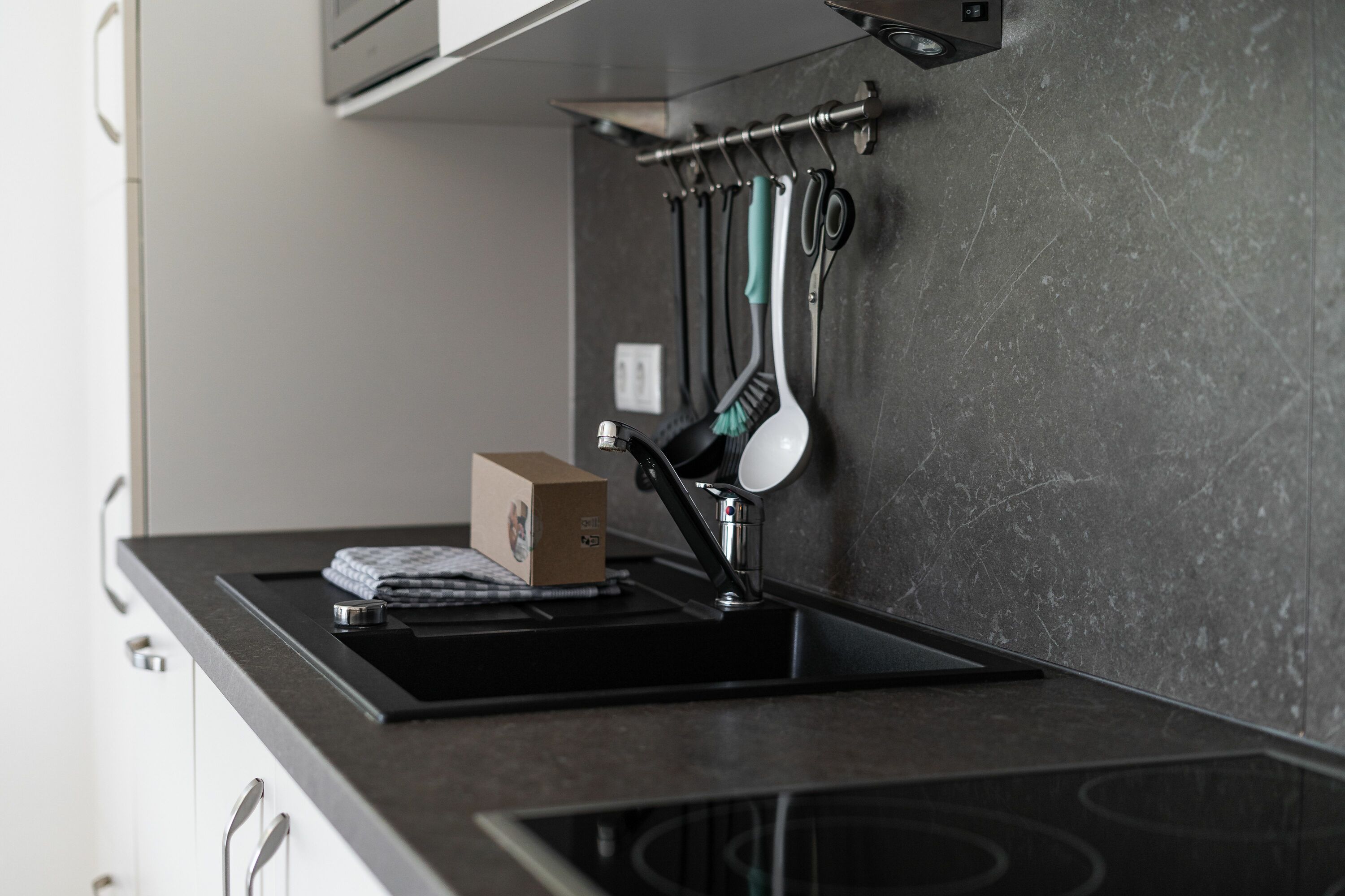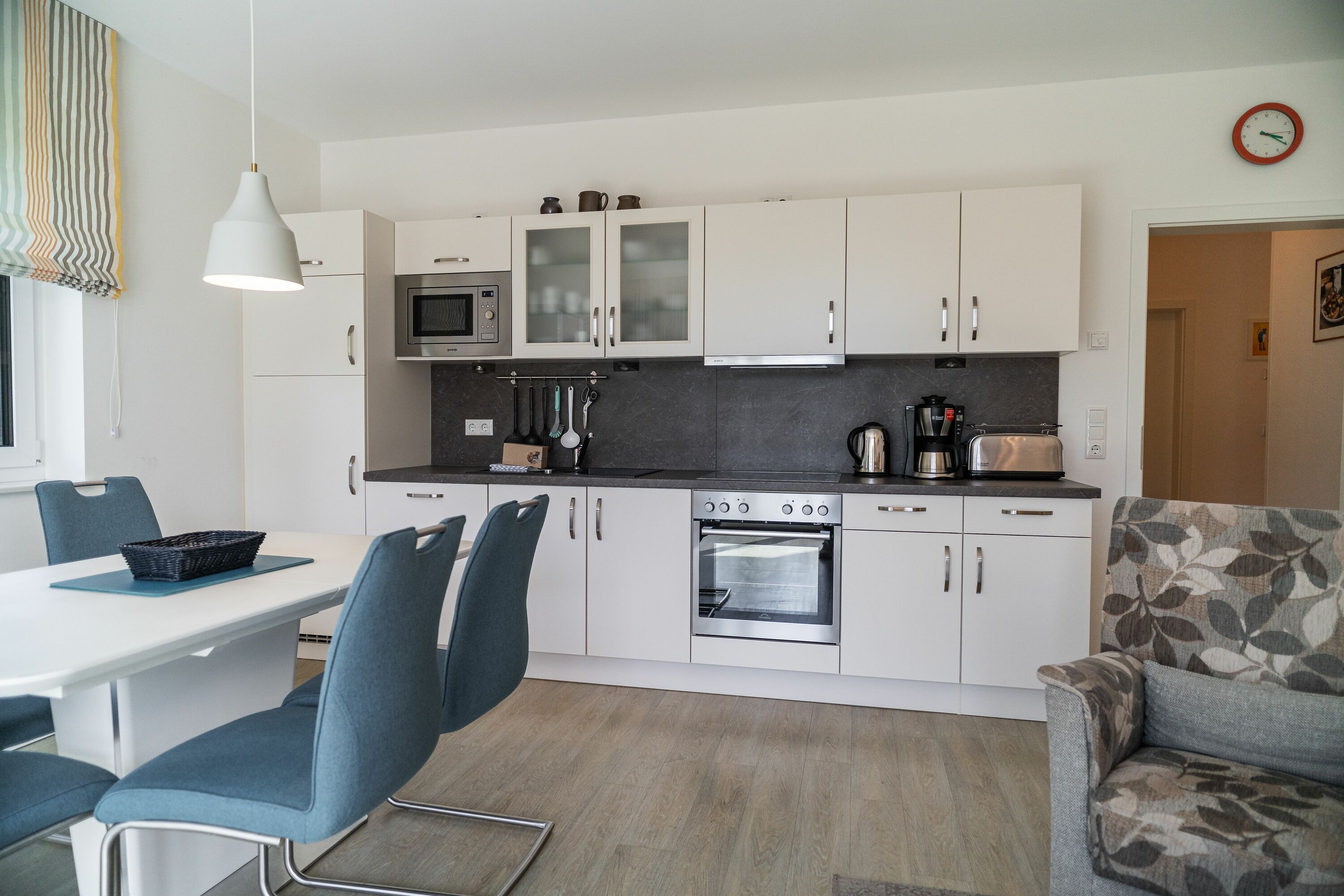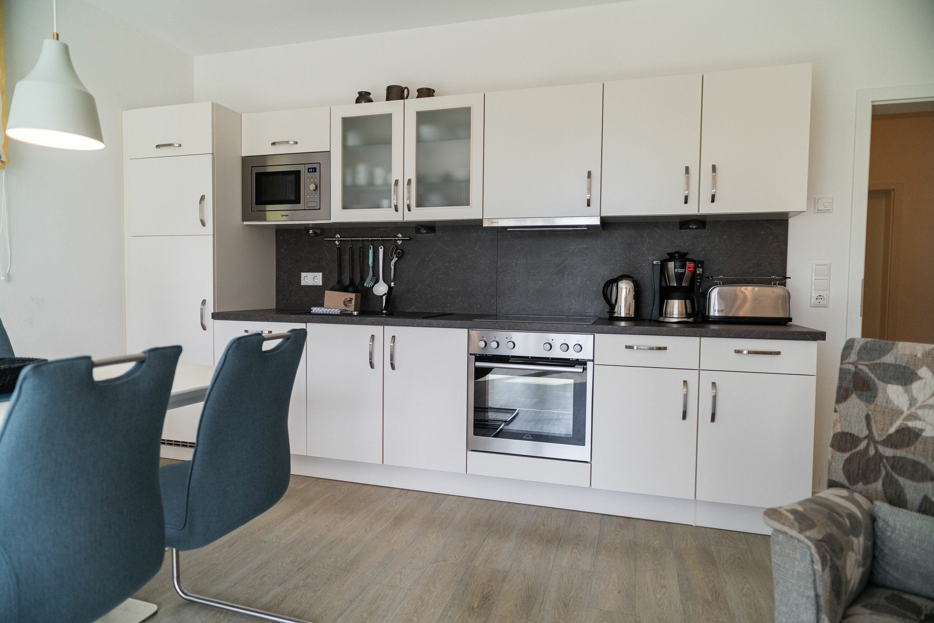 Die Einbauküche ist vol ausgestattet mit Geschirrspüler, Kühlschrank, Tiefkühler, Backofen, Cerankochfeld, Toaster, Kaffeemaschine, Wasserkocher und Mikrowelle. Geschirr und Gläser sind in ausreichender Anzahl vorhanden.
