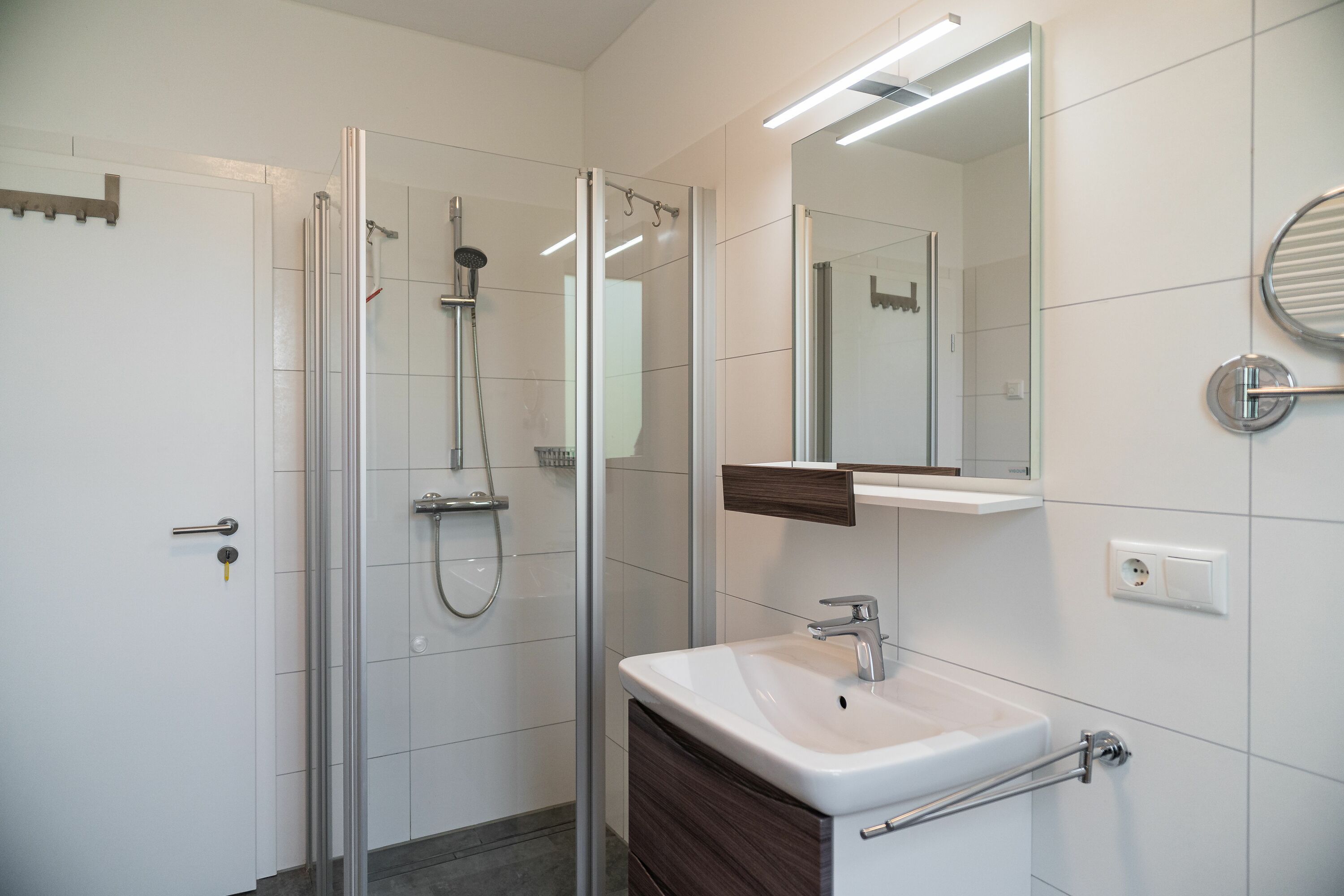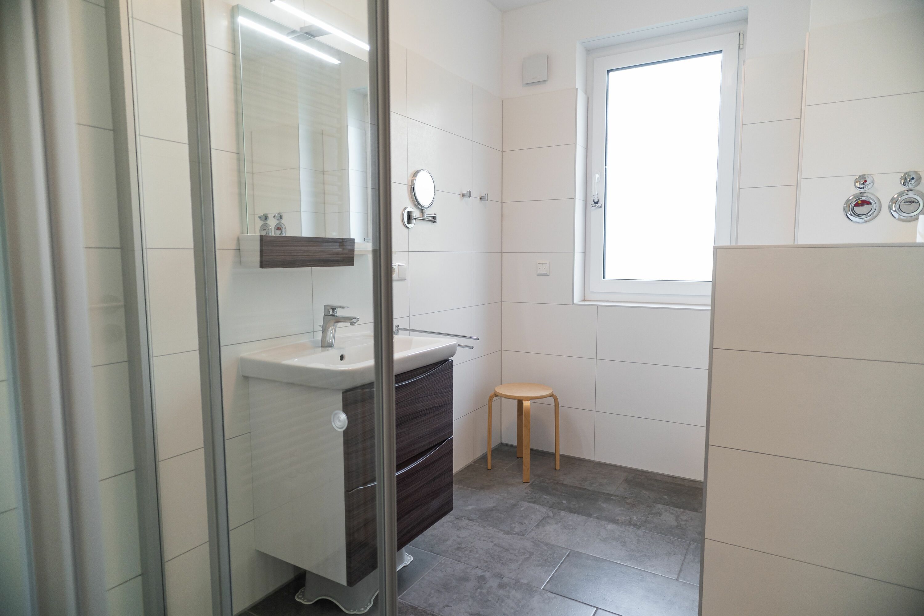Das helle Badezimmer mit Fenster und bodengleicher Dusche verfügt über einen wandhängenden Badezimmerschrank, einen Waschtisch mit großem Spiegel, einen Kosmetikspiegel, einen Haartrockner und einen beheizbaren Handtuchhalter.