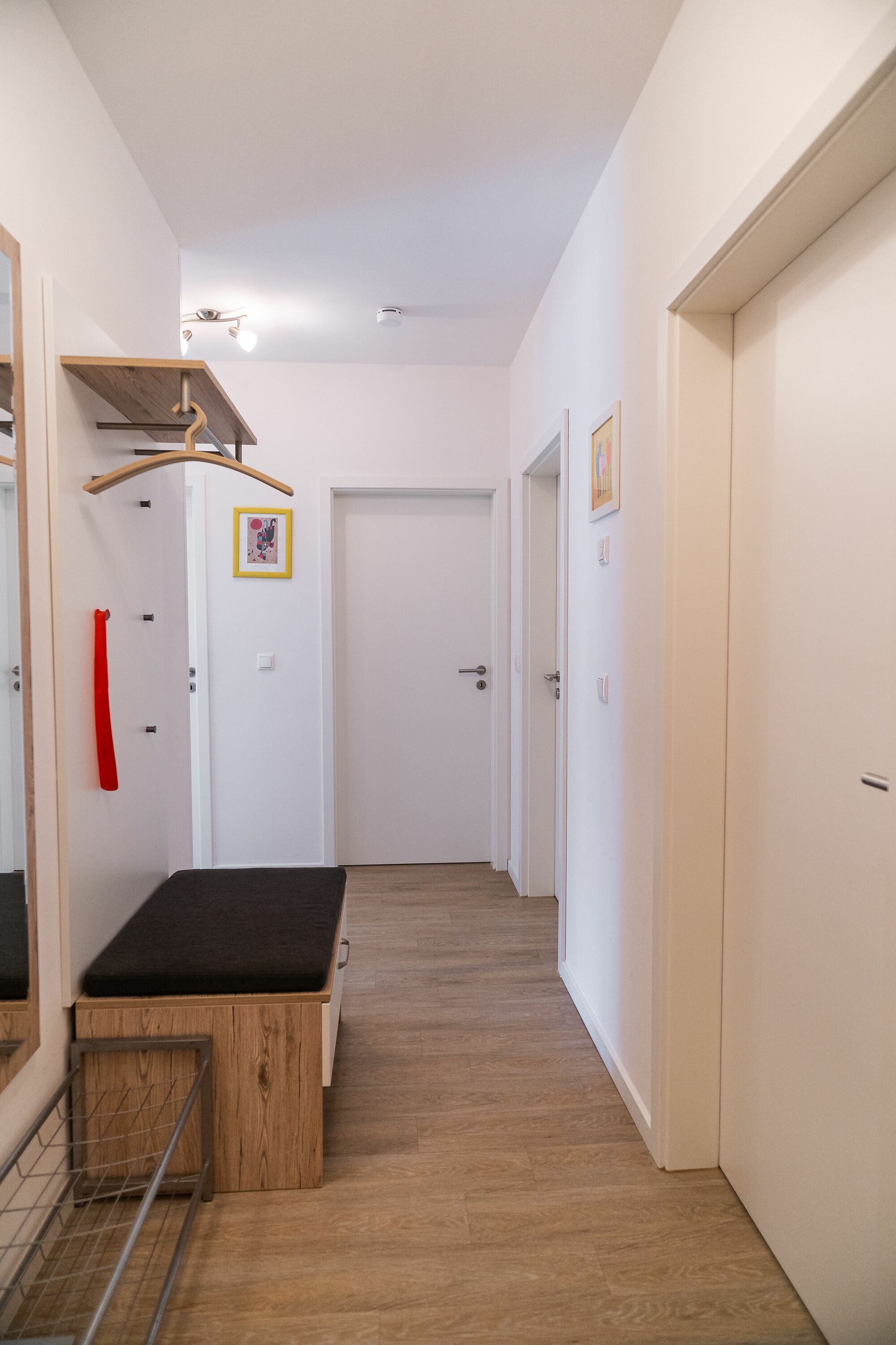 Im eigenen Wirtschaftraum in der Wohnung befindet sich eine Waschmaschine und der Wäschetrockenständer mit Bügelbrett und Bügeleisen.